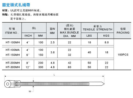 产品材质:尼龙扎带采用UL认可尼龙66(Nylon 66)材料注塑制成,防火等级94V-2,具有良好的耐酸、腐蚀、绝缘性,不易老化、承受力强。操作温度为-20℃到+80℃(普通尼龙66)。